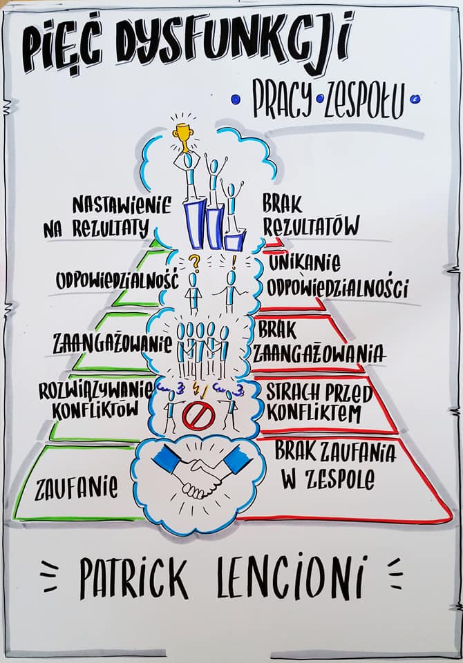 …jest bardziej prawdopodobne, że członkowie zespołu, którzy nawzajem sobie ufają, angażują się w konflikt, nie unikają przyjmowania odpowiedzialności za podejmowane decyzje i wymagają tego od innych, odłożą na bok indywidualne priorytety i skoncentrują się na tym, co najlepsze dla ogółu. Tacy ludzie nie ulegają pokusie, by na plan pierwszy wysuwać interesy własnych działów, rozwój indywidualnej kariery, czy też własne ego, a nie to, od czego uzależnione jest osiągnięcie sukcesu przez zespół. Dysfunkcje tworzą piramidę, co doskonale przedstawiła na rysunku Ewa Lewczak